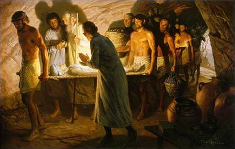 And he charged them, and said unto them, I am to be gathered unto my people: bury me with my fathers in the cave that {is} in the field of Ephron the Hittite, In the cave that {is) in the field of Machpelah, which {is} before Mamre, in the land of Canaan, which Abraham bought with the field of Ephron the Hittite for a possession of a buryingplace. There they buried Abraham and Sarah his wife; there they buried Isaac and Rebekah his wife; and there I buried Leah. (Gen 49:29-31)